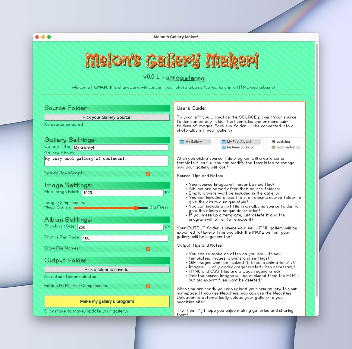 Hello welcome to the official Gallery Maker thread, I hope this will be a useful info space for your Gallery Maker questions! What is this??Melon's Gallery Maker is a free program you can use to automatically create your own HTML photo/gif/artwork galleries on your website! It is fully customisable with HTML templates and supports many image formats and options! It also has a built-in Neocities publisher that lets you update your gallery easily!You can see the full info page here! https://melonking.net/free/software/gallery-maker  Downloads??You can download the gallery maker on Itch! https://melonking.itch.io/melons-gallery-makerWhen you run the Gallery Maker on mac or Windows you will need to allow insecure software to run; this is because I have not paid developer fees to Apple or Microsoft! On Mac you can do this by going to the security tap in system settings!Backstory?For those curious, this started as a weekend project. I wanted to backport some of the TextureTown code into a gallery for my site.. and then I thought Id share the code.. and then I thought Id share it with a UI.. and so on.. it got a little out of hand but its done now  Help and questions:This thread is for asking questions, getting help, reporting bugs and for sharing your galleries and templates! Feel free to discuss the gallery maker below!If you are more technical you can also view the source code here; you are welcome to report bugs on GitHub and you are also welcome to work on the code and make pull requests!What is registration?? In the 90s-00s shareware software was semi-free software that let you pay to unlock a full version of the program or get extra features; this program is PRETEND shareware! You can register it, but it won't unlock anything, this is a free program, its just for fun  Template Examples:The gallery maker comes with four premade templates you can use on your site or modify to your liking! Default gallery is a simple layout you can use as a basis for creating your own template or matching the gallery to your site!
