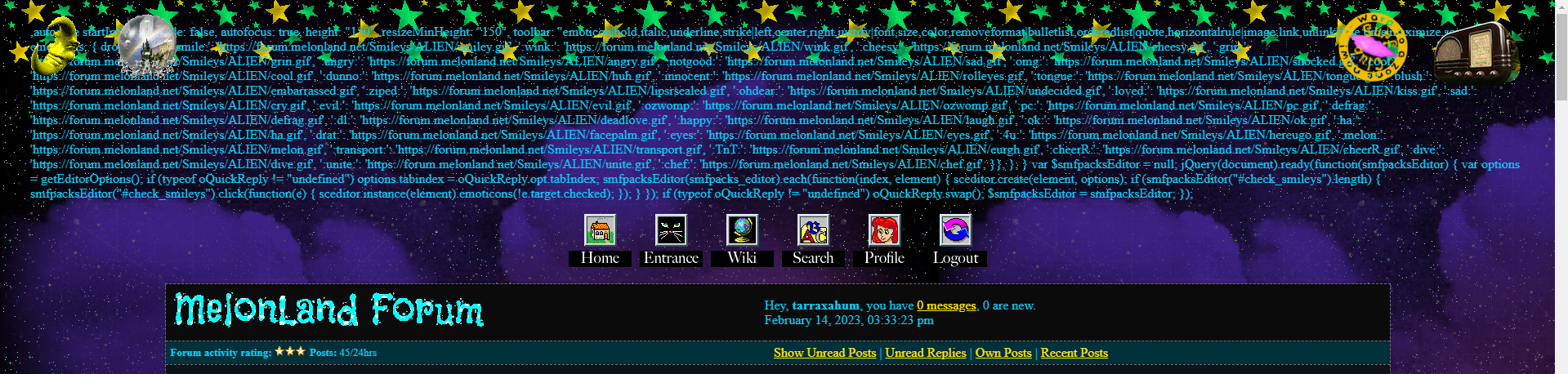 ⛄︎ ∙ Forum Discussion / Re: BUG WATCH! - If you see a bug report it here!« on: February 14, 2023, 03:43:56 pm »I had this thing jump out at me just now when browsing the forum (the Physical Media thread in particular): Spoiler ![]() [close] Refreshing the page and ctrl+f5 did nothing BUT when I went back to the main forum page it all went back to normal. Haven't been able to replicate it since. I do suspect that was probably some momentarily glitch, maybe even on my side, or maybe I just happened to catch some work in progress happening, but I decided I'd better report it just in case??? ![]() 13