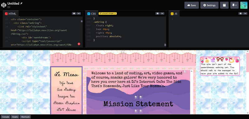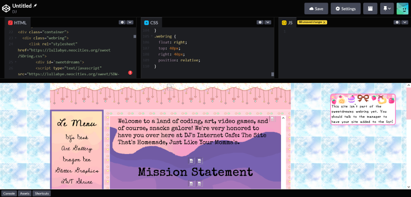 Today, I was accepted into the sweetdreams webring!! I'm very happy about it, but I'm having some difficulties putting the webring button where I want. For reference, here's what I have so far: