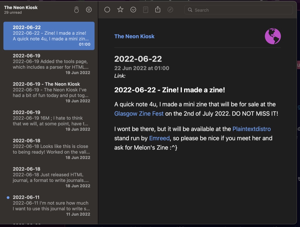 (Kiosk Atom feed on left, Melonland RSS feed on the right - both are generated from the same html page)