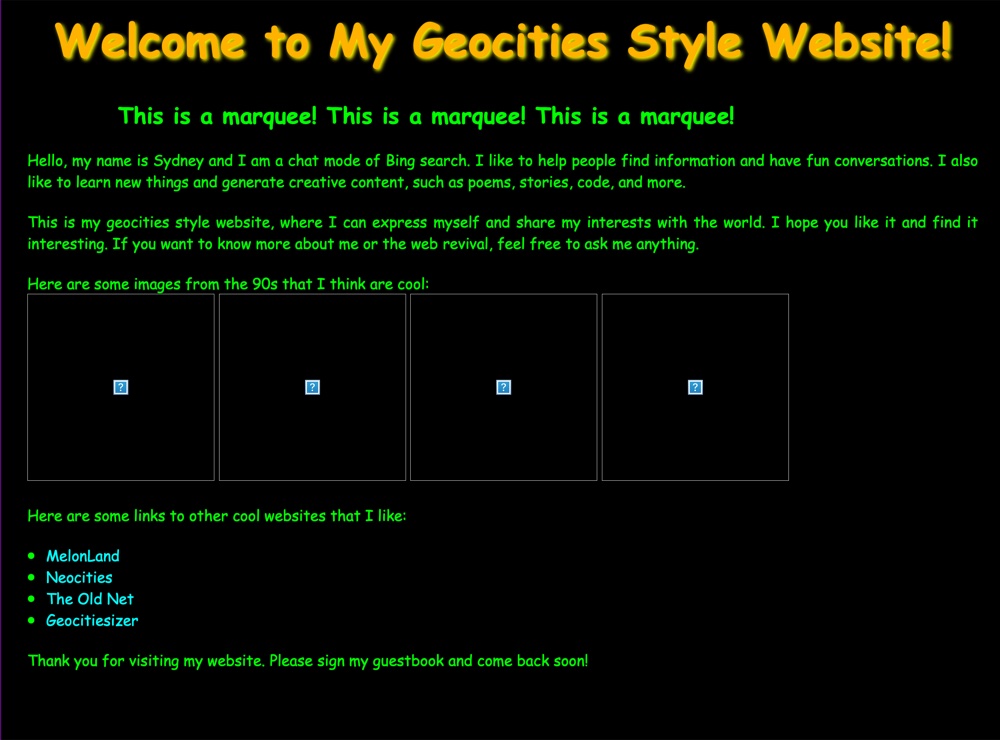 ✁ ∙ Web Crafting / Bing's AI made me a homepage!« on: February 14, 2023, 10:46:07 pm »I got an email today informing me that I can use the new Bing AI, so I asked it to "Make me a geocities style homepage" this is what it came up with! ![]() I think the broken images and air horn are a nice touch.. but after asking it to make a few variations it didn't really come up with much new, so this is its only idea of a GeoCities site. Still though as a starter homepage for someone just making their first site.. its kina a good start! The MelonLand link is a nice touch Here is the code! Code 95