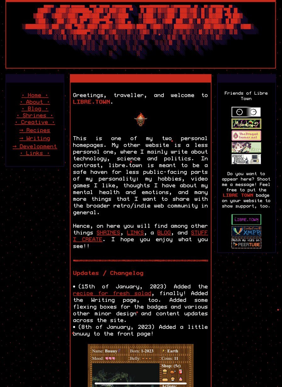 ✁ ∙ Web Crafting / Re: Your Website Year in Review - how have things changed?« on: January 16, 2023, 12:03:40 pm »My website has changed rather radically because I wasn't happy with its fundamental concept. When I first started out building Libre.Town, I wanted it to be just that: a town, a virtual world to explore in a similar manner to old text adventures. Things I would want to share would be found in places they logically would be in: my writing in the library, photos in a gallery, music in a radio tower. I planned NPC interactions, and even an ARG for the site. ![]() Unfortunately, I found that this was a wayy too ambitious project. Every avenue opening up would require me to build an exponentially larger amount of additional "rooms" adjacent to it, and with my habit of writing static sites per hand, this grew impossible quickly. The site was littered with 404s and eventually I burnt out. This was also due to many technical issues, like keeping the CSS per-site for the lack of external style sheets. Additionally, I grew tired of its inconsistent design. So I reworked it last Christmas, to be more visually and technically consistent. It also did not aspire to be an explorable text adventure anymore, instead I settled for content rich sites without exorbitant fluff. That way, I could actually work on content for the site instead of scrambling to fill in decorative blanks. ![]() 172