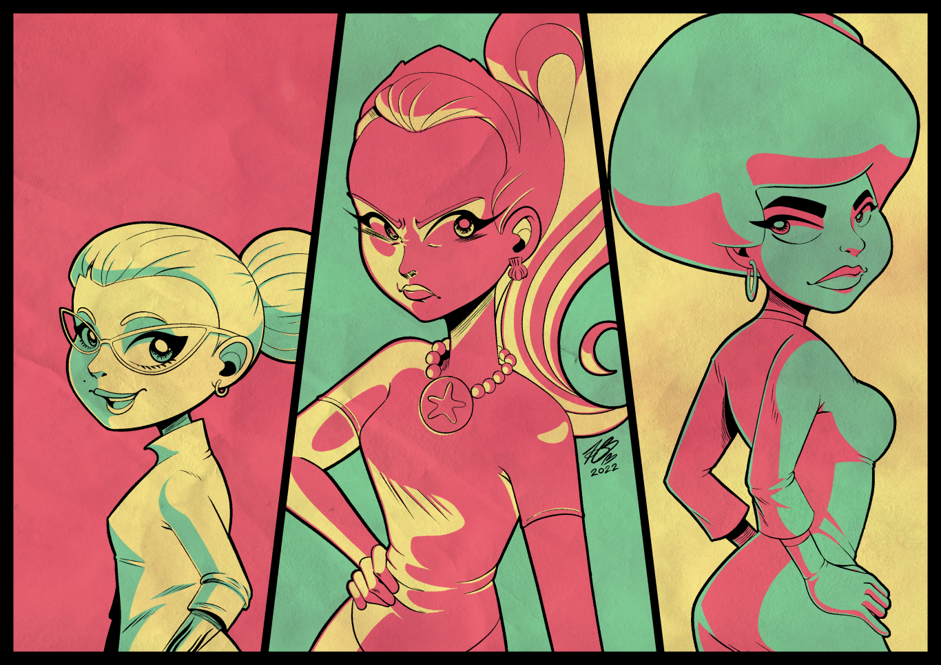Alt text: Digital illustration of Sybil Pandemik, Girl Stinky and Dr. Momma Bosco from Sam & Max. It's in a minimalist style where they are coloured using only pastel red, yellow and green. The illustration is like a retro-styled comic book page where each character is in their own panel.