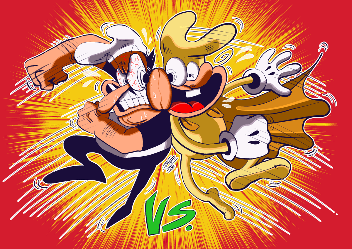 Alt text: Full colour illustration of Peppino and The Noise from Pizza Tower bashing into each other, cheek-to-cheek in combat. There's a red and yellow action flash behind them and the VS. symbol is shown below them.It was my first time ever drawing Bayonetta and my first ever fully-fledged art of Pizza Tower! I can't stop watching that game, and I hope to play it very soon