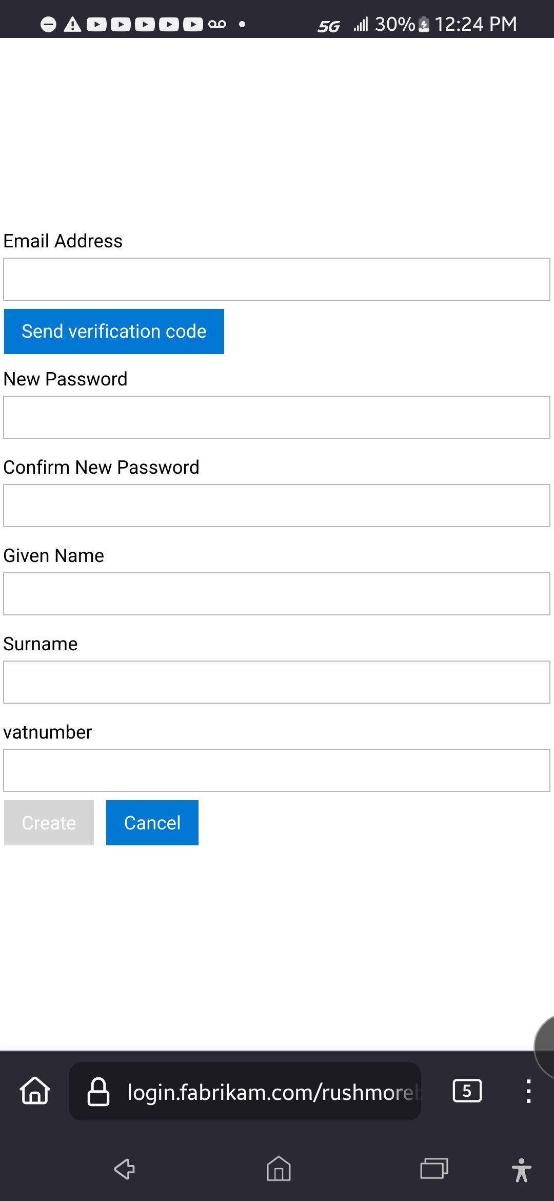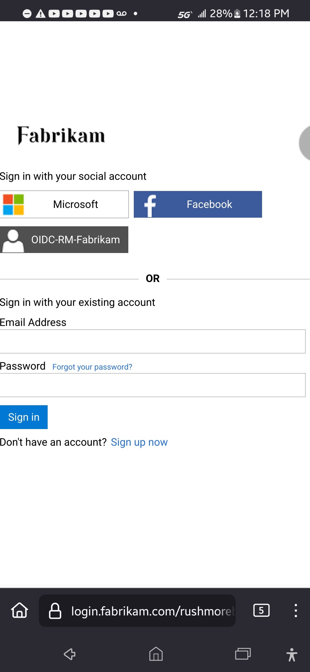 A login with facebook button, a Microsoft button, a OIDC-RM-Fabrikam button? there also a Email address and password prompt. Additionally, I also saw that there was a sign up now button, I tapped on it, expecting it to take me to a non-existent page, but no. it took me to an actual sign up prompt.