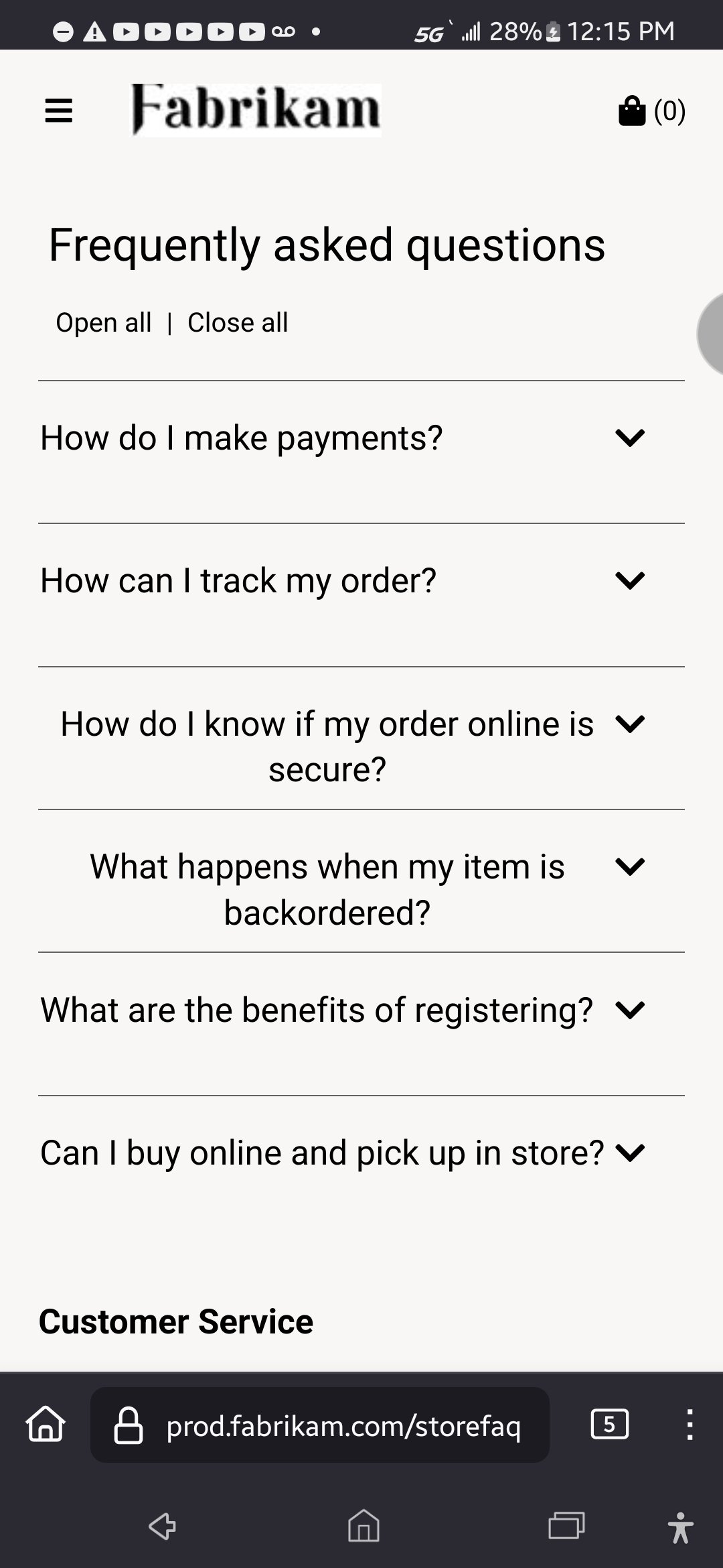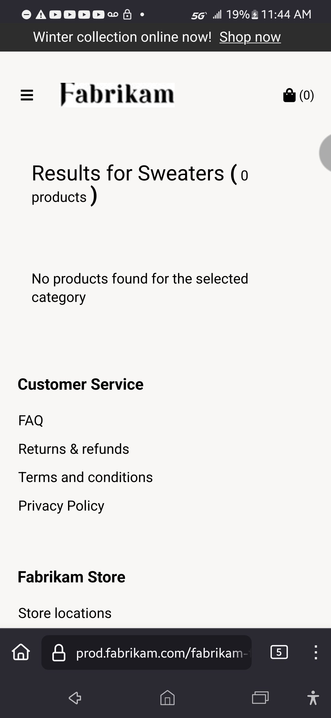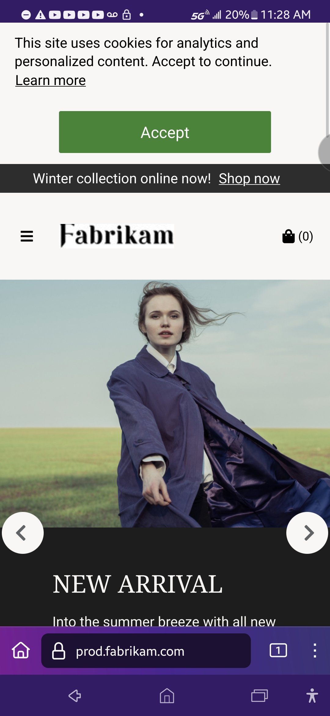 https://prod.fabrikam.com/), we will be taken to a normal looking shopping website. Even having the cookies banner on top.