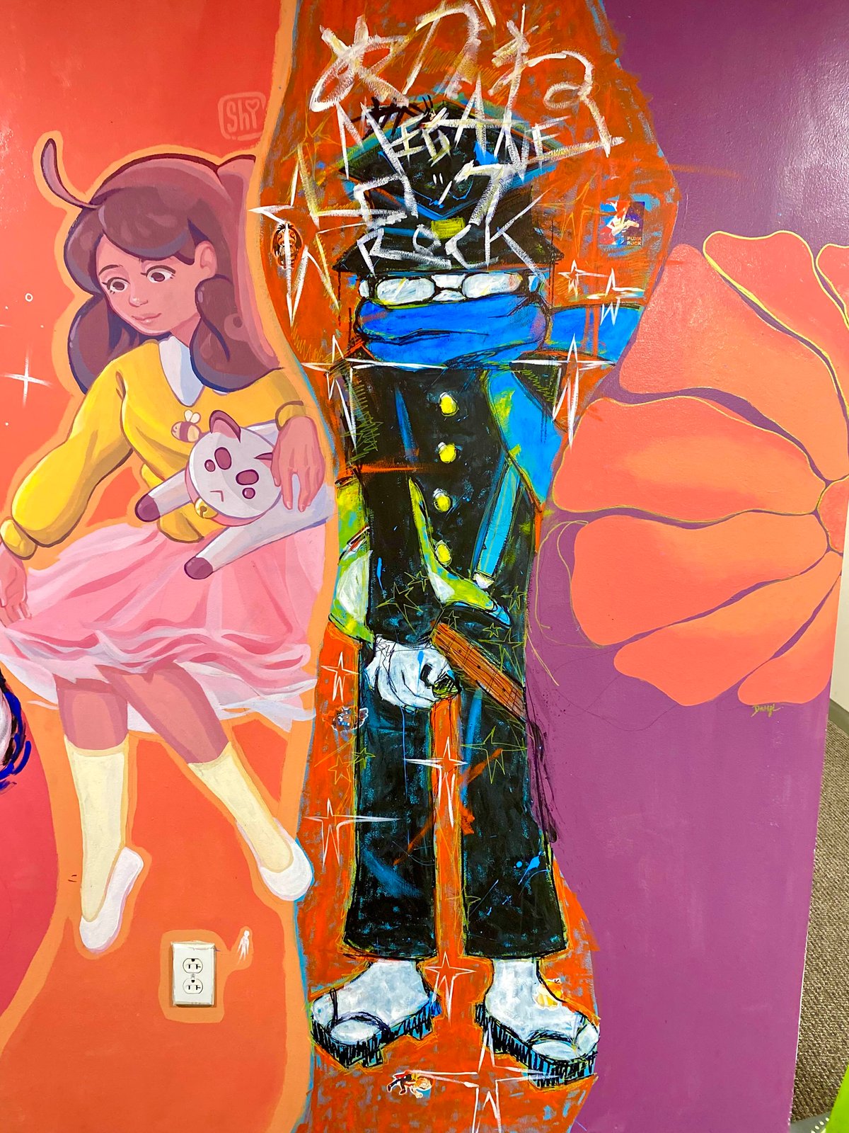 today i finished a part of a collaborative mural where i drew nakaji from popn music :D my friend drew the bee to the left of it, it really shows the contrast between our interests and personalities xD
