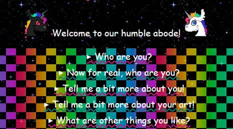 I also made these little animated pixel sprites since I am using two characters, as to distinguish which is the one talking. There's also several versions with different expressions, although I would also encourage you to distinguish multiple characters' "voices" via the