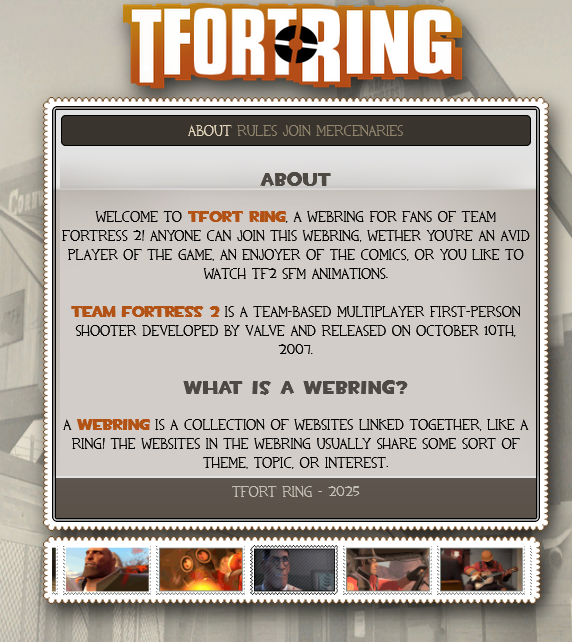 I'm surprised there isn't already a TF2 webring, but I'm glad I get to be the one to make it lol. You just have to be a fan of TF2 to join, whether you play the game, read the comics, or anything in between.