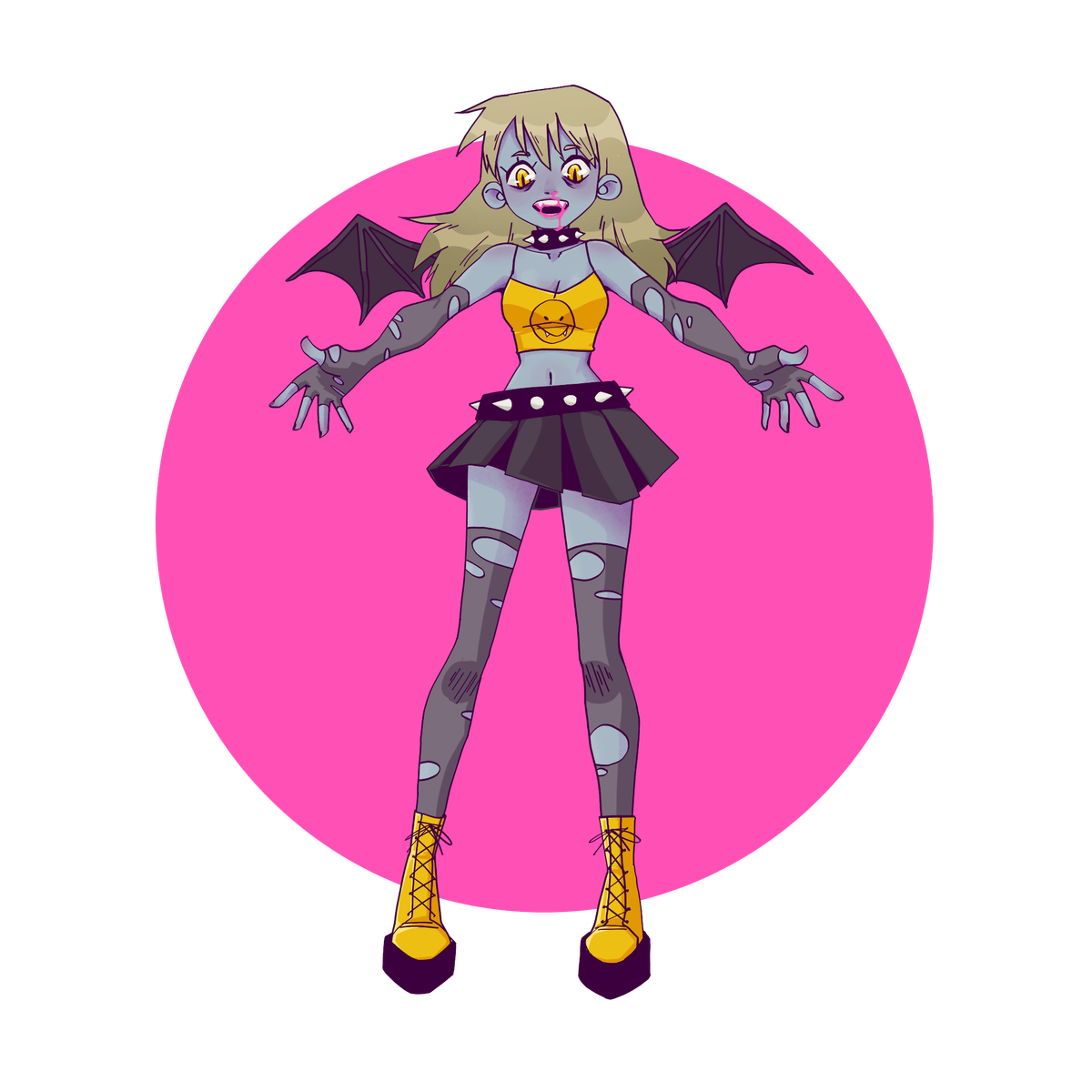 Kish is an punk vampire who is (quite literally) eating the rich (lol). Jk she's pretty harmless but she is really active in her community and believes in mutual aid which sometimes clashes with her need to, yknow, drink human blood.