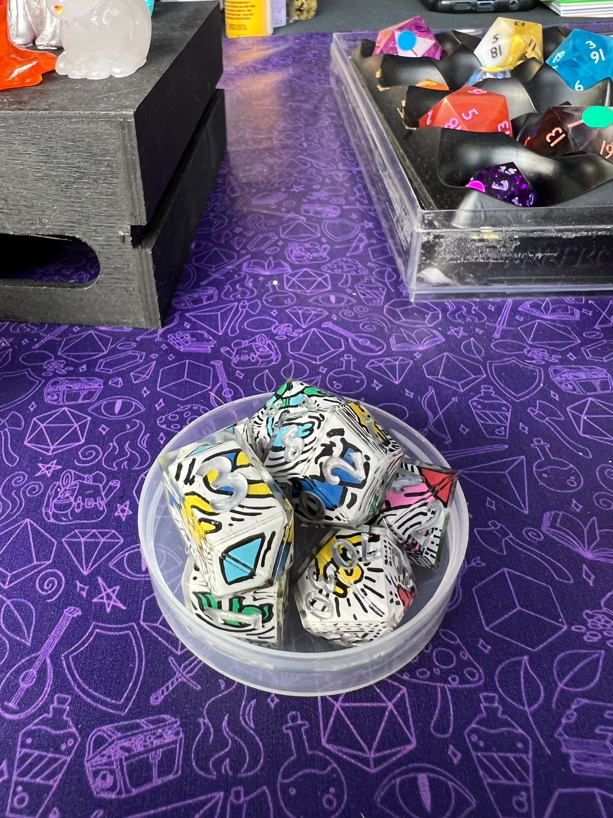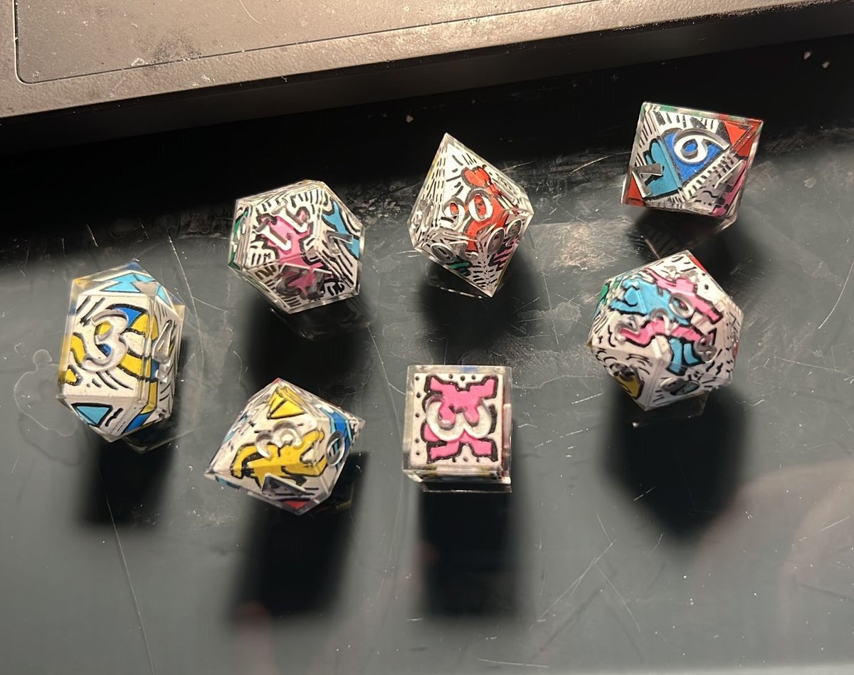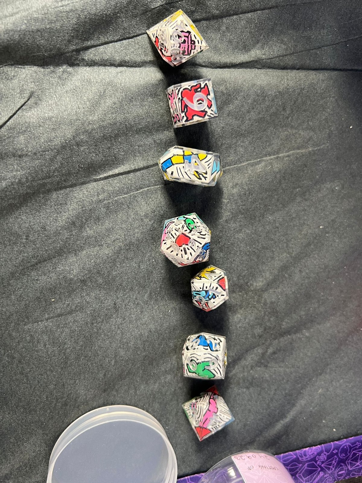I did a collab with a local resin artist. In which she gave me dice blanks of a dnd set, I painted them however I wanted to, she encased them in resin and painted the number. And at the end there is a unique one of a kind dice set that is now mine!