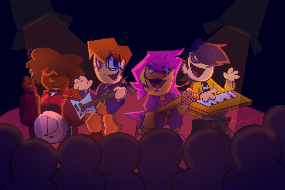 in order, these are nathos [he/it] bennett [he/him] ash [xe/xem] and piper [she/her]! theyre in a band together called the drawing board! theyre kind of losers but i digress. i mean, what kind of losers would be CHOSEN TO SAVE THE UNIVERSE BY THE GODDESS ODA!?!?!?!? thats right !! these guys are the saviors of a universe in danger of destruction !!!!!! pretty big burden to put on some little guys amirite ^_^ so they have to go around the universe and kill these six big evil monsters! but also the horrors happen. BUT ANYWAY! who even is this oda lady, anyway?