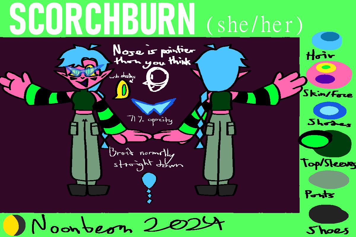 HI SCORCHBURN [she/her] !!!!!!! tdb meets her on their travels, and she's no ordinary bounty hunter... but aside from that! she's a bounty hunter in space who has some pretty... unorthodox ways of dealing with criminals. so she has both the cops AND criminals after her! she also likes bombs.