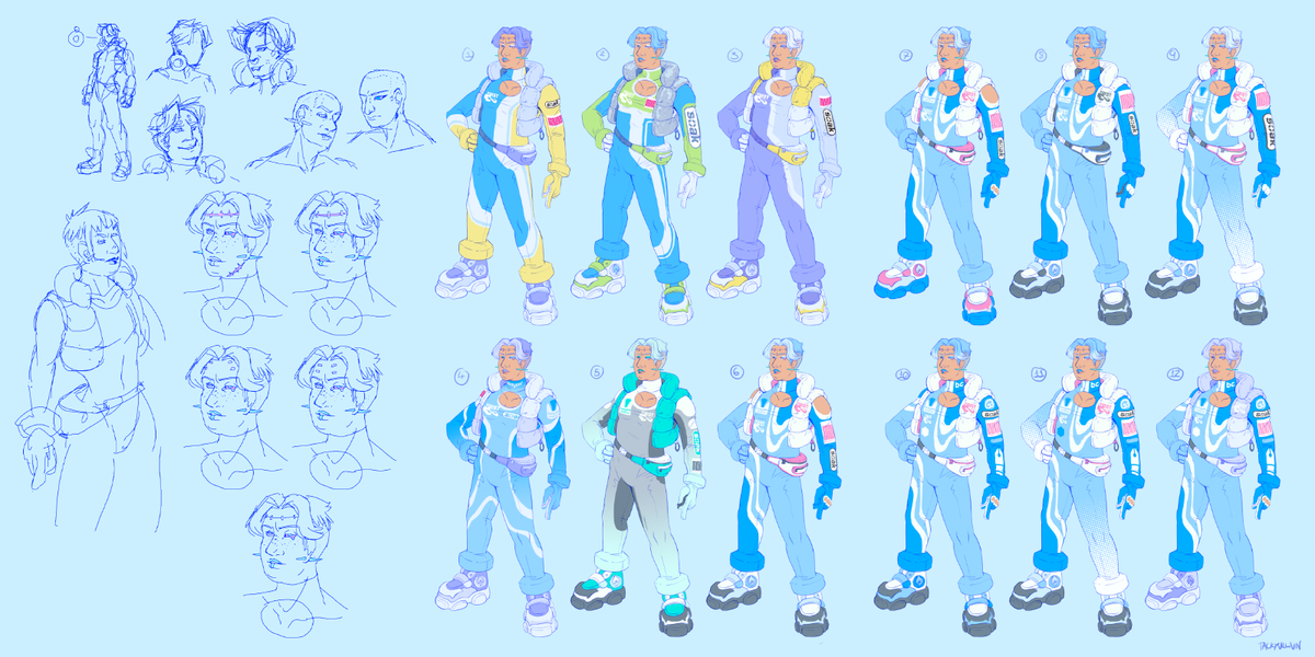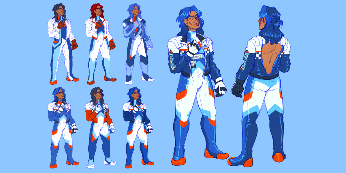 I originally came up with the concept of the character who would become Orion around three years ago. I had this idea about a racer who was thinking back to their romantic life during this big race as a sort of exploration of my ADHD, using this inherent distractibility and half focus as a narrative device but also to show their success regardless of this different way of working. They're much more casual and down to earth than the majority of AG Racing drivers having come from a lower class background, which gained them a big following in young adult fans and brought a new audience to the sport. They're the gossip rags' darling, regularly appearing in paparazzi photos on messy nights out and doing the walk of shame back from other racers' hotel rooms.