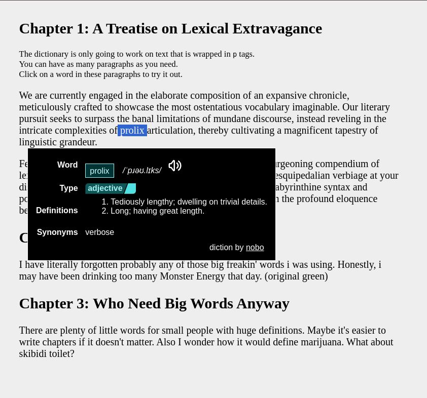 Optionally you change the hue of the dictionary highlights. Define this style block after linking the css and select a hue from 0-360.