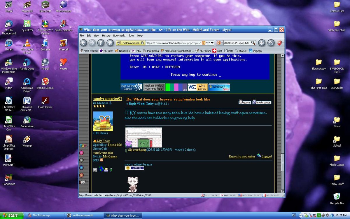 Here's my browser! I keep it themed like Netscape and I found a way in my browser (Mypal, a fork of Pale Moon) to disable tabs so I have an old-school browsing experience! Sadly SeaMonkey doesn't work properly with my school's network or else I'd probably be using it. (Or maybe it's a problem with my Windows proxy, I'm not sure.) I like to keep it in a nice small window in the middle of my screen so I can see other things (like IM windows) as well as just see my pretty desktop background, because what's the point of having it if I never see it? My browser is an older version, so I have a newer version (Mypal 68) for things that don't work, like some of my school's learning system as well as G-Docs, etc., and Supermium (based off of modern Chromium) for my school e-mail, since that's pretty picky about what it works in.