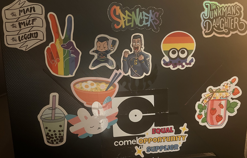 do have stickers on my laptop, though there aren't very many ( -.-) the most interesting one is the Marisa yukkuri, i got it cuz it's so stupid i may as well lmao the other things are kinda just my online nickname but in a weird sticker form. they were made at a real life group i go to, we had to do it. i really need to get more, i thought of some random printed ones, and probably get some pre-existing ones if i can find them and they don't cost a fortune. like some LittleBigPlanet stickers (from in-game or even the logo itself) or some of a subtle trans flag or even a dumb QR code would be great!