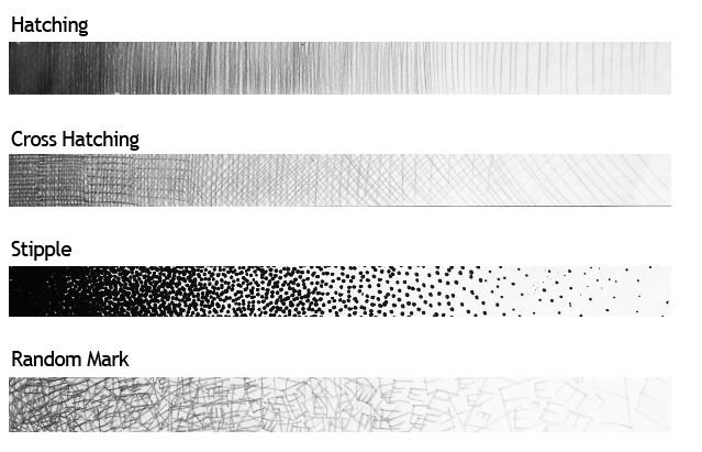 When these simple shapes become easy to draw, learn how to make tones of various shades within their borders. One way of doing this is by steadily moving your forearm back and forth like a windshield wiper, making a series of parallel lines that are somewhat evenly spaced from one another (i.e.: "hatching"