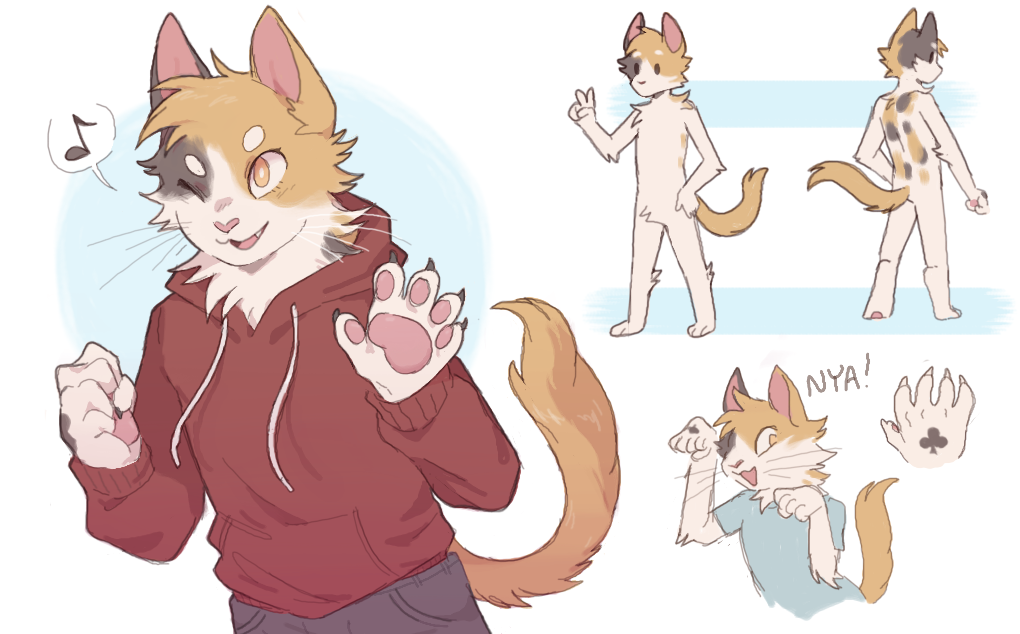 This is a somewhat outdated ref sheet, but it's close enough to what Kitty looks like currently that I still use it as a base. They were designed in part by an artist on tumblr by the name pkoctarian but they shut down shortly after unfortunately  As an aside, I love your sona OneMillion! He looks so fun!