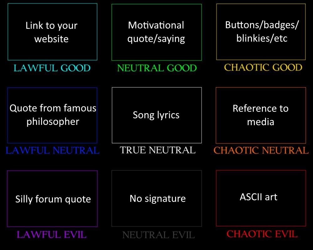 Well spotted @KittyTheKat. I'm radical-neutral evil, because you all are wasting tons of bytes with your signatures. I might be able to sign in to set the forum settings to dump all the signatures, however when using the forum as a guest, having to endure all this redundant, useless information in the text flow line, it makes me evil indeed.