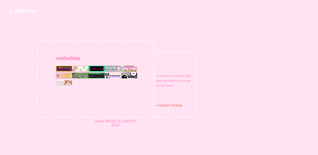 <div id="sidebox"><p><sup>A collection of neocities sites and other internet neighbours</sup></p><p align="center"><a href="/index.html">« return home</a></p></div>