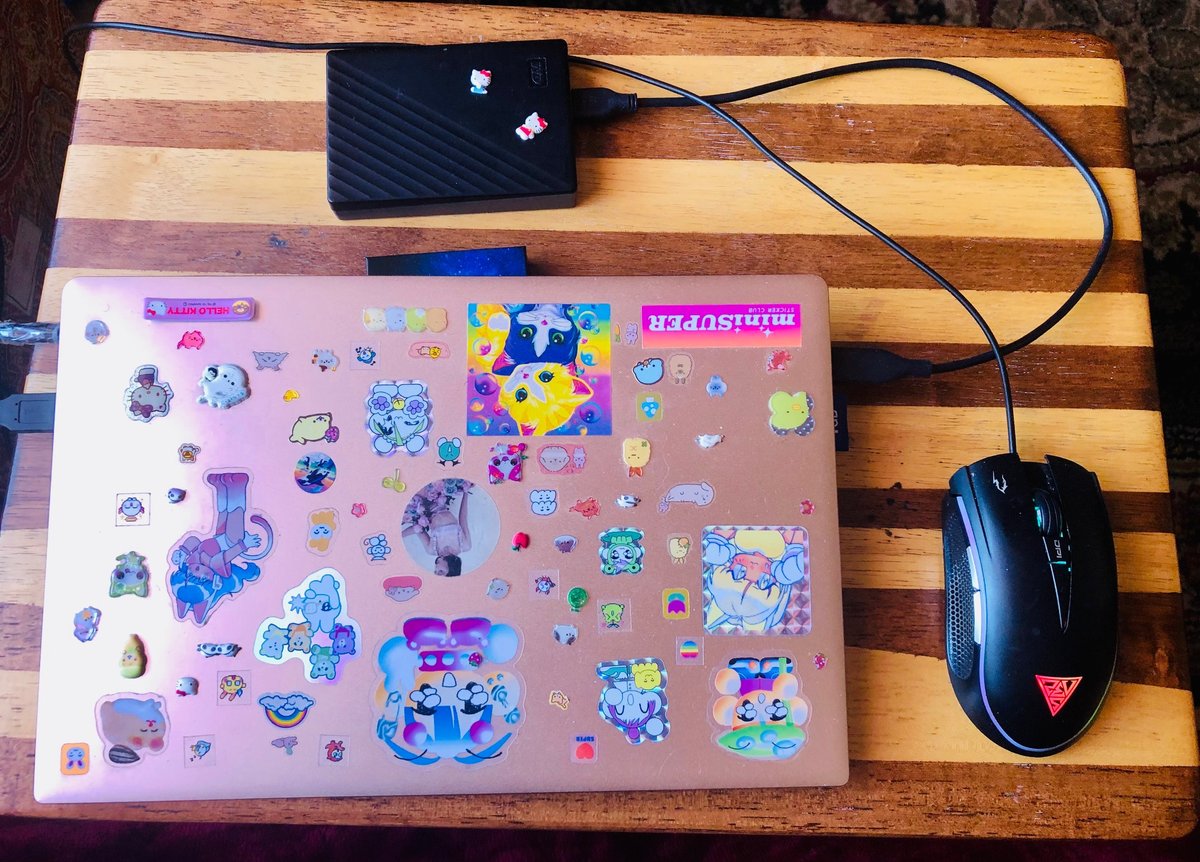 woahh im jelly! behold my smol foldable table with my smol 13'' laptop that i do everything on. it's resting on a lil box for airflow >_>'' (my *actual* desk is occupied by my partner since he has an actual computer lol). most of the stickers are from mini super sticker club !!