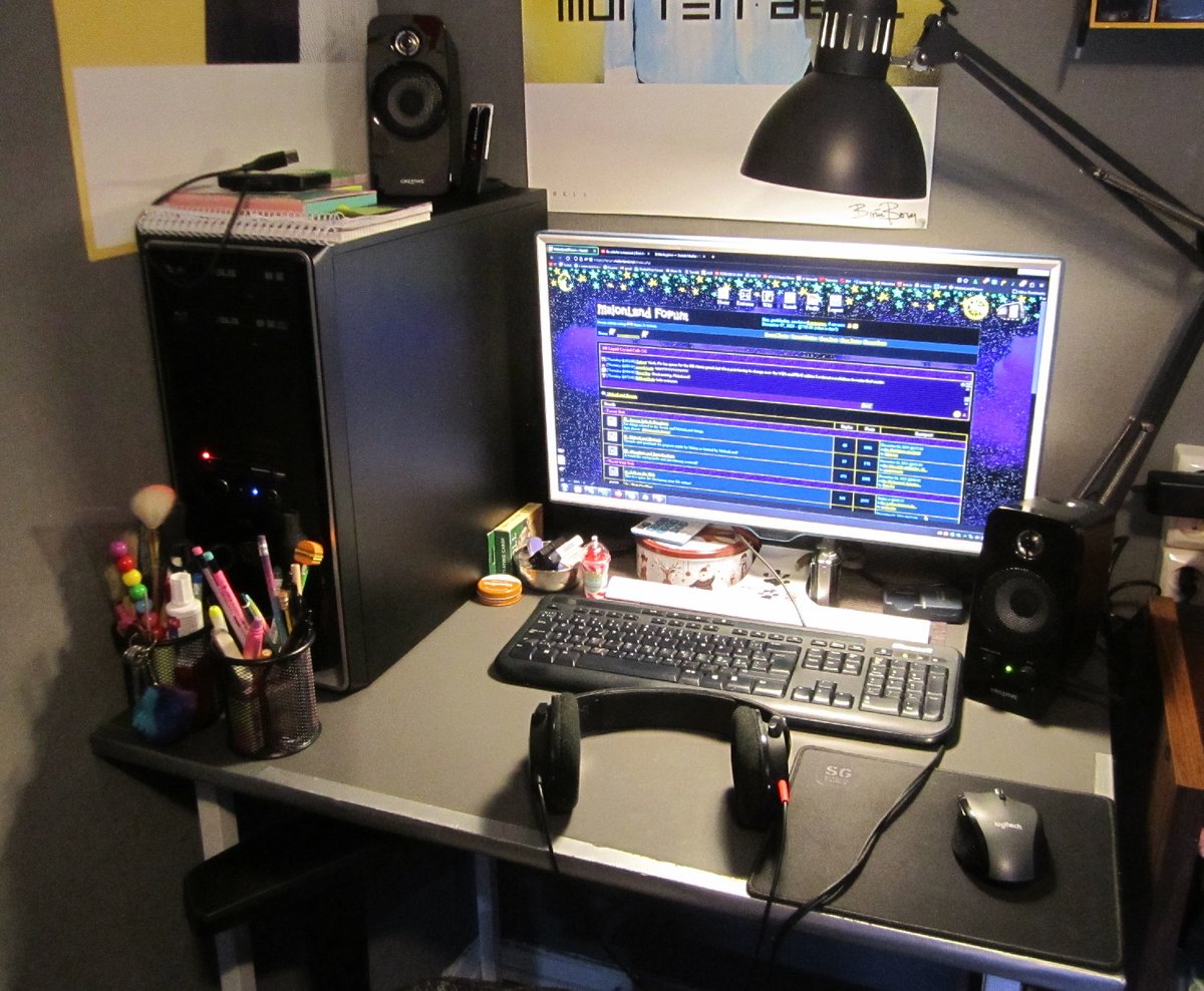 This is my current desk set up. I like it a lot because its cozy, its next to big windows, and theres room to be messy, but its not personalized at all cus its my brothers set up that I've just taken over since I've moved back home. I need to add some more of my own things
