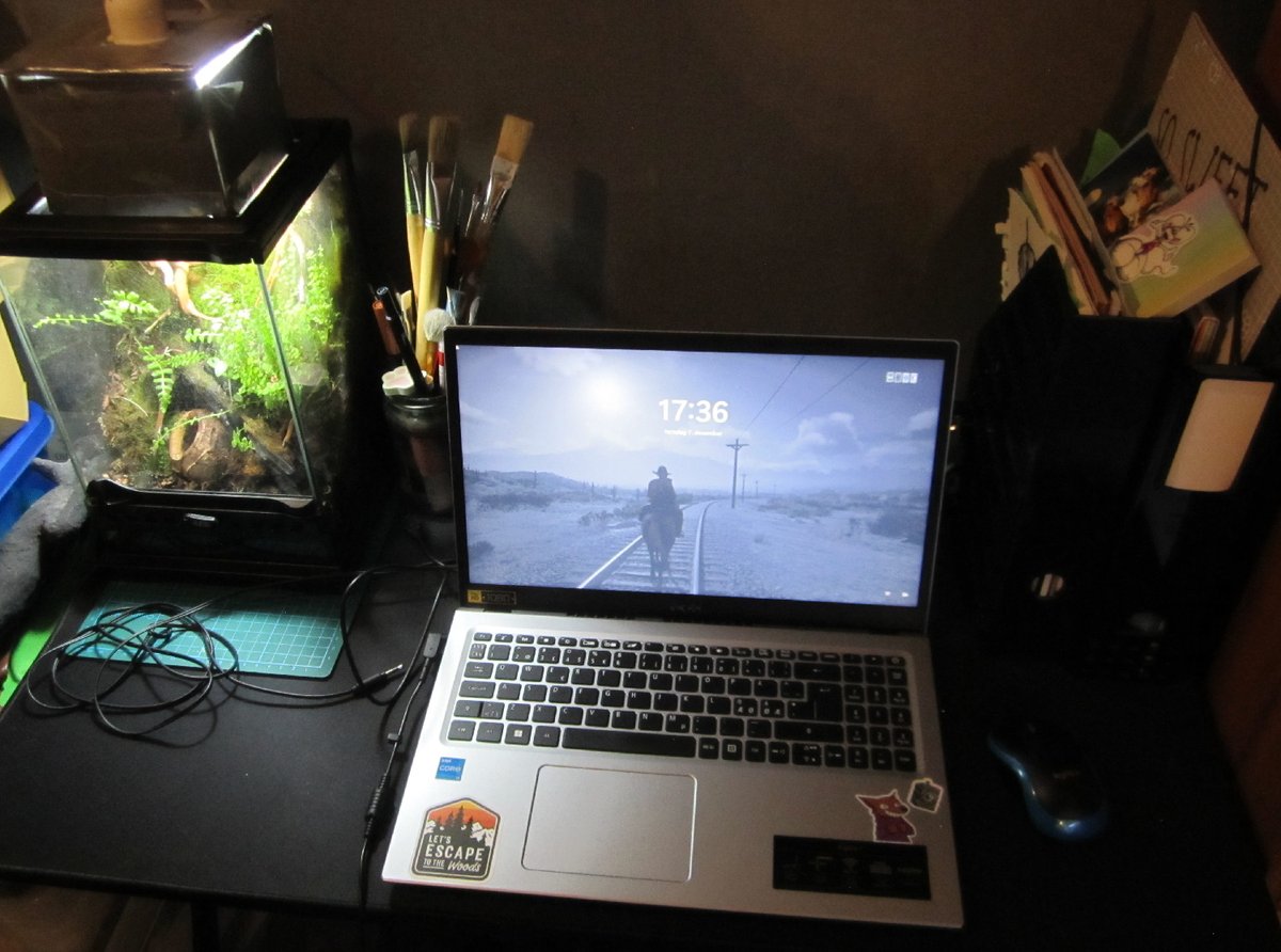 My desk, in what I call my Goblin Cave. It's where I also work remotely from home too (though my work laptop is tucked away as I am on a short vacation currently haha)