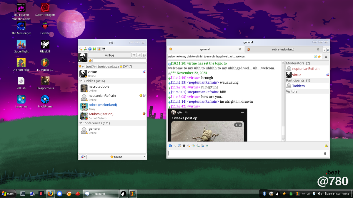THIS IS AN OUTRIGHT PSA FOR PEOPLE WHO WANT SOMETHING LIKE AIM OR MSN AGAINseriously USE Jabber! Jabber, aka XMPP, is designed to operate almost the same way as those classic messengers, but with modern functionality. That means you can use it like discord/whatsapp if you want, but you can also do what I do and use Psi+ as a client. Get a look at the absolute glory that is this! And its super theme-able too, this is just how I like it to look personally!  If you want to know how to set it up, this thread is pretty helpful. If you cant decide on a server, sure.im and tigase.im should work fine Also if you do wanna get on XMPP, feel free to message me! I love meeting new people here. You can private message (on melonland your Jabber ID if you would like, or you can just message me since I have my XMPP public. Click the link or copy it (and remove the "xmpp:" from the start) next to XMPP below my name on this post and you can shoot me a message easy!